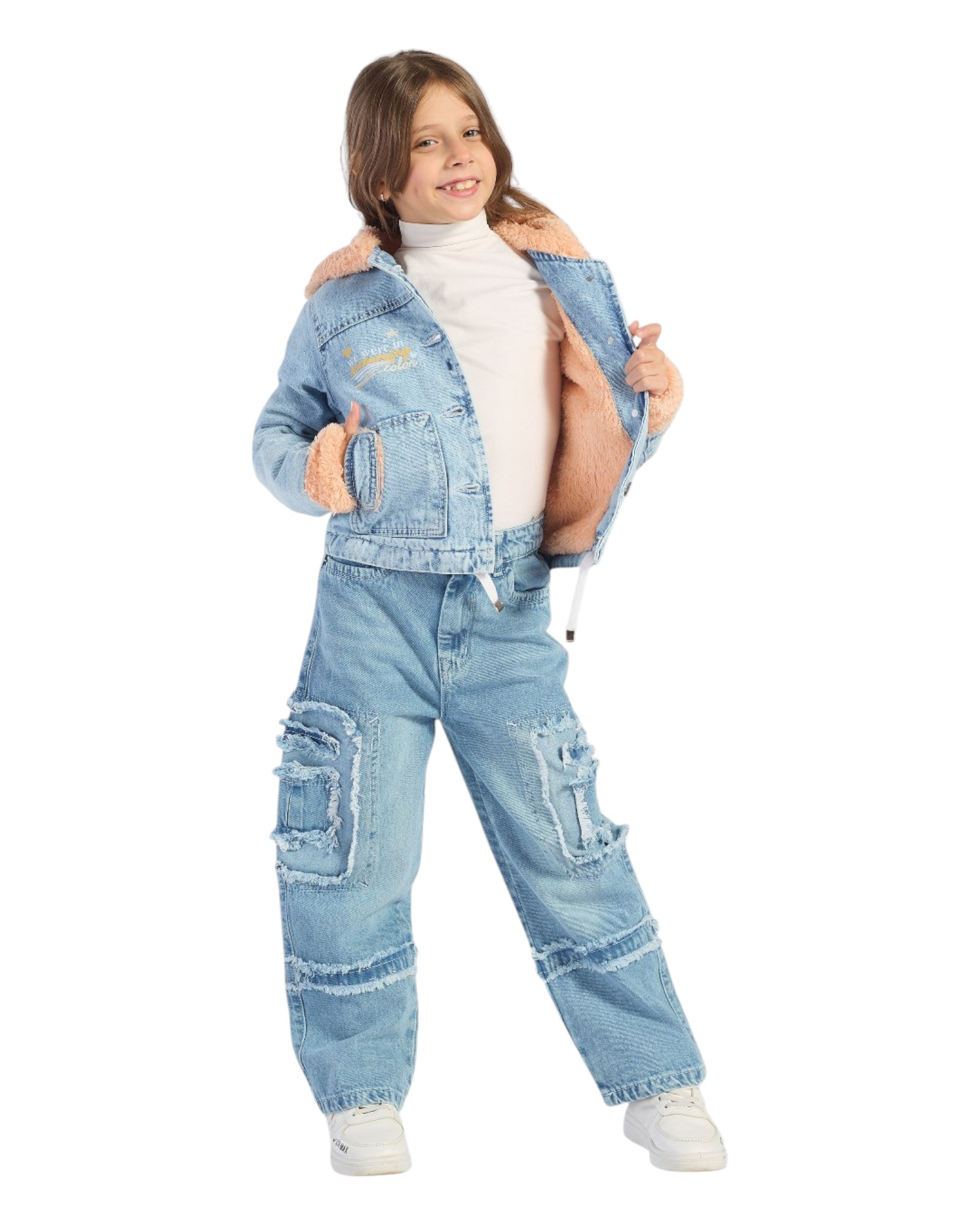 تتميز هذه السترة الشتوية الجينز للأطفال بتصميم أنيق ودافئ، مما يجعلها مثالية لحماية الصغار من البرد مع الحفاظ على مظهر عصري. تحتوي السترة على بطانة ناعمة من الفرو الصناعي في غطاء الرأس، والأكمام، والجزء الداخلي، مما يوفر مزيدًا من الدفء والراحة. يضفي غطاء الرأس المزين بأذنين صغيرة لمسة مرحة وجذابة. كما تأتي مع جيبين أماميين مزينين بالفرو، بالإضافة إلى حزام شد عند الخصر لضبط المقاس. يوجد تطريز صغير لشخصية كرتونية على الصدر يضيف لمسة جميلة. هذه السترة مثالية لمشاوير الشتاء، حيث تجمع بين الأناقة والراحة والدفء.